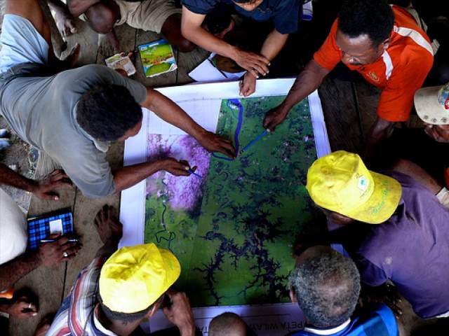 Men group in Boepe village and participate in a mapping exercise in Merauke district, Papua province, Indonesia. (Photo: CIFOR)