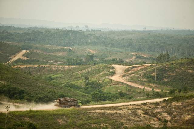 A logging truck transporting rainforest timber inside Asia Pulp and Paper's PT Wira Karya Sakti pulpwood forest license. Jambi Province, Sumatra, Indonesia. (Photo: Rainforest Action Network)