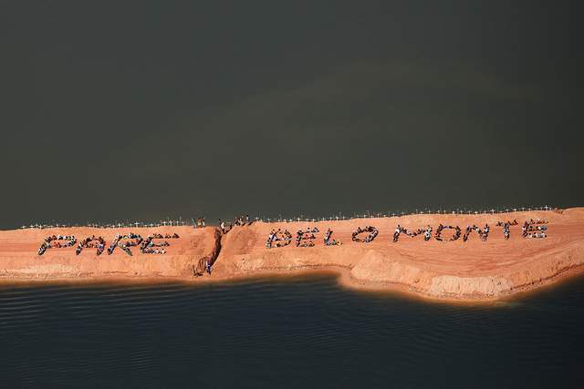 Three hundred indigenous people, small farmers, fishermen and residents take over the site where the Belo Monte hydroelectic plant is under construction and line up to form the phrase: “Stop Belo Monte” so as to warn the international community about the impacts of the project. (Photo: Atossa Soltani/ Amazon Watch / Spectral Q)