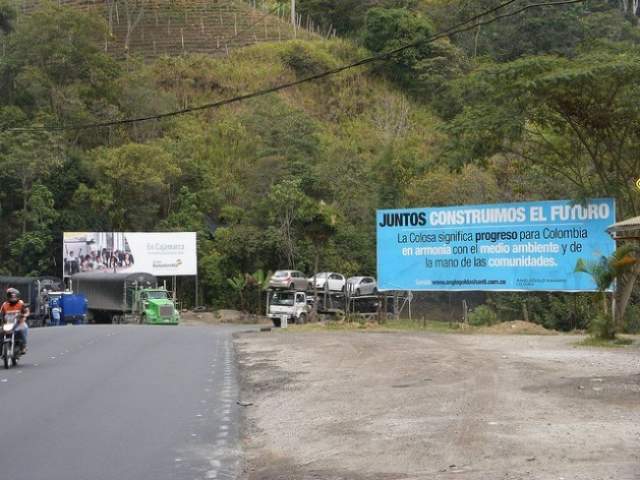 AngloGold Ashanti Colombia billboard on the road from Ibagué, capital of Tolima, to Cajamarca: “Together we build the future: La Colosa means progress for Colombia in harmony with the environment and hand in hand with communities.” (Photo: Constanza Vieira / IPS)