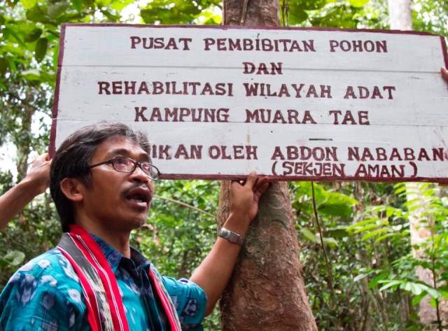 Abdon Nababan, secretary general of the Aliansi Masyarakat Adat Nusantara, a network of indigenous groups, stands near a sign in a forest in Indonesia. (Photo: Sigit Pratama)