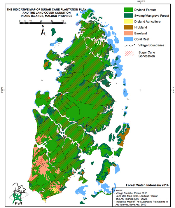 Analyzing land use plans for Aru, a famed biodiversity hotspot prominently featured in Alfred R. Wallace's classic text, The Malay Archipelago, Forest Watch Indonesia found that local government officials have turned over 480,000 hectares (1.2 million acres) to 28 companies held by PT. Menara Group, a plantation conglomerate. 76 percent of the area is currently natural forest. Converting the area to sugar plantations would cut Aru's forest cover by half, from 730,000 ha to 365,000 ha.