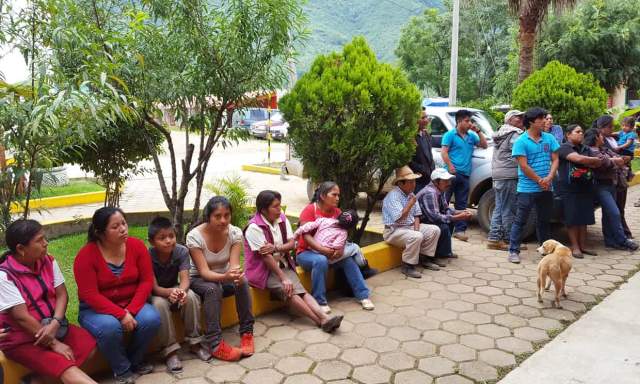 People gather in Santiago Nuyoó’s main square to hear about the new mobile phone network. The TIC social cooperative has a licence to install networks in 356 marginalised municipalities. Photograph: Nina Lakhani