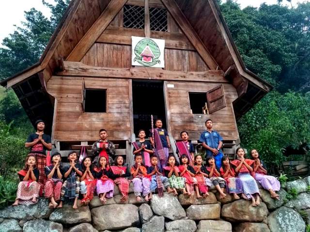 Anak anak suku Batak Toba duduk di depan Rumah Belajar Sianjur Mula-Mula, Samosir, Sumatera Utara. Foto: Ayat S Karokaro/Mongabay Indonesia