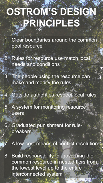 One design principle with very strong empirical support is having locals monitor the use of a resource. “In sustainable forests around the world, the users are the active monitors of the level of harvest occurring in the forests,” Ostrom explained in her Nobel lecture. But the effectiveness of the monitoring depends on who does it. “Users monitoring forests is more [effective] than when government does it.” Also, as Ostrom saw in Nepal, resource users sanction others, but in a graduated way for repeat offenses. Draconian punishment for first-time infractions ends up causing mistrust and resentment, leading to less willingness to cooperate, she found.