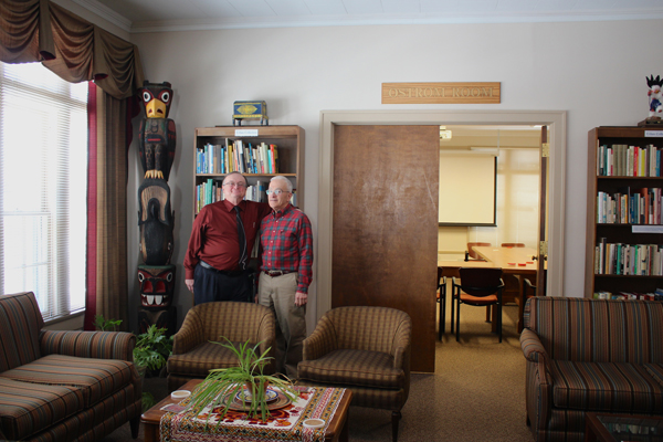 Indiana University-Blooomington Professors Mike McGinnis and Burnell Fischer near the Ostrom Room inside the The Vincent and Elinor Ostrom Workshop in Political Theory and Policy Analysis on campus. (Photo: Wendee Nicole (c) copyright 2014)