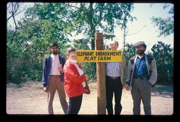 Photo taken March 1993 of elephant embankment platform in Ghadgain, (L to R) Indra Sharan K.C., Douglas Vermillion, Elinor Ostrom and Rabi Poudel during the final day of Workshop outing to the RCNP. (Photo: the Digital Library of the Commons)