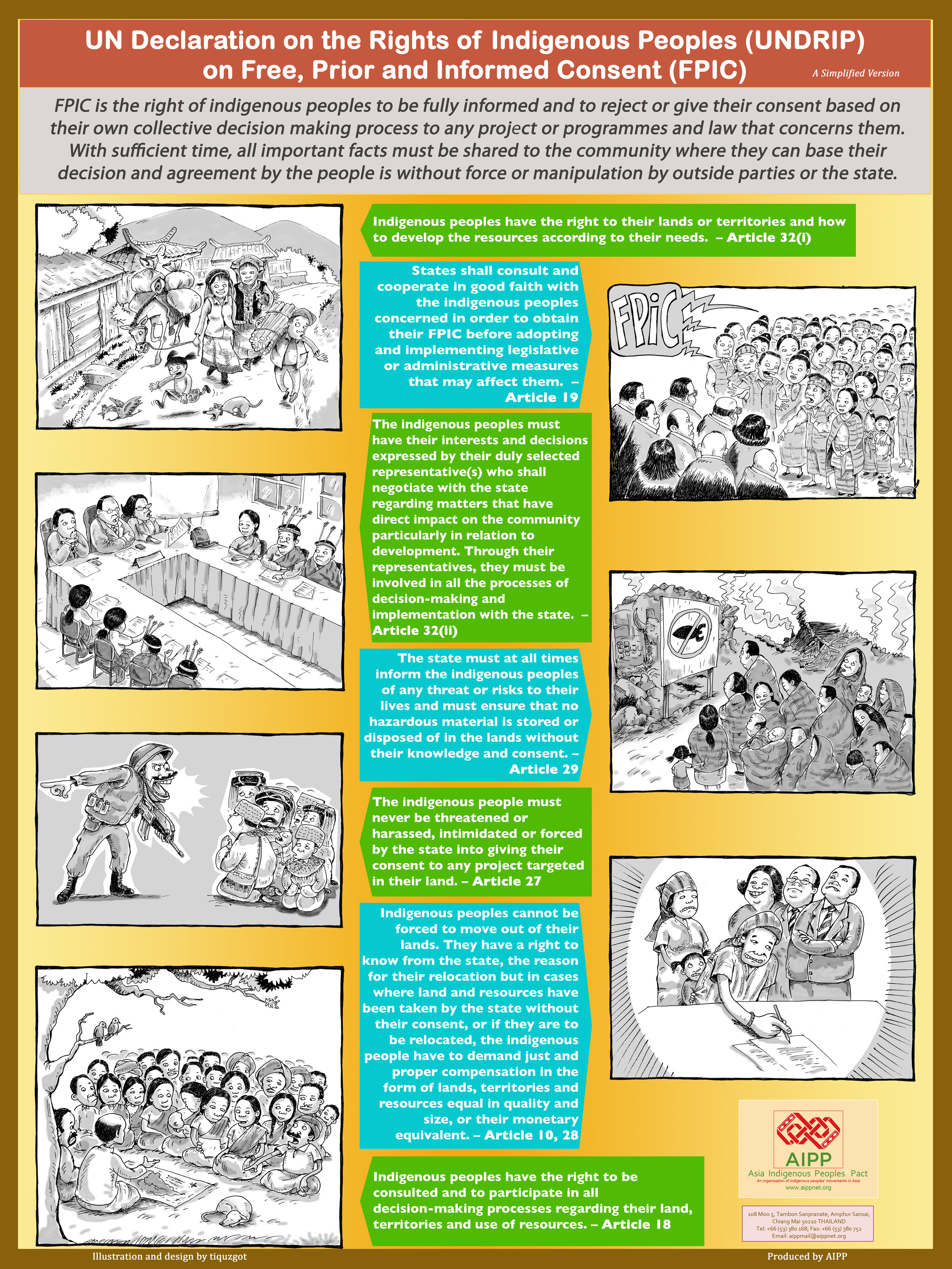 A simplified version on the UN Declaration on the Rights of Indigenous Peoples (UNDRIP) on Free, Prior and Informed Consent (FPIC) produced by Asia Indigenous Peoples Pact (AIPP, 2012).