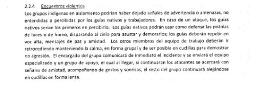 De son côté, Perenco assure « travailler fortement avec toutes les autorités pertinentes du Pérou et en totale conformité avec le plan de développement qui a été approuvé par Perupetro [la compagnie pétrolière nationale, ndlr] et le Ministère des Mines. » Puisque les autorités gouvernementales péruviennes ont donné leur accord, celui des 20 000 Indiens concernés comptent finalement peu... Quant à l’existence de communautés autochtones volontairement isolées, dans le voisinage du lot 67 ou du tracé de l’oléoduc, Perenco affirme ne pas avoir d’indices confirmant leurs présences. Ce qui ne l’a pas empêché d’éditer son cahier de consignes en cas de rencontres fortuites (voir le document ci-dessous, en Espagnol).3
