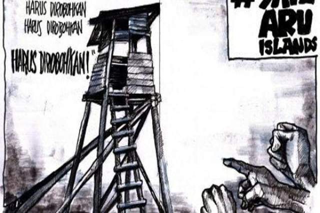 Lukisan perlawanan yang menggambarkan, penolakan terhadap perusahaan yang akan membuka kebun tebu ratusan ribu hektar di Kepulauan Aru. (Foto: savearuisland.com)