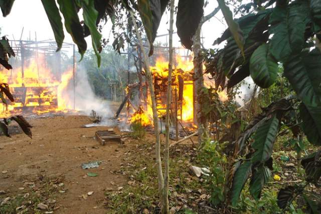 Rumah warga adat yang dibakar dalam operasi gabungan TNBBS di Bengkulu. Konflik antara masyarakat adat dan taman nasional terus terjadi dan menyebabkan beberapa warga adat ditangkap. (Foto: AMAN Bengkulu)
