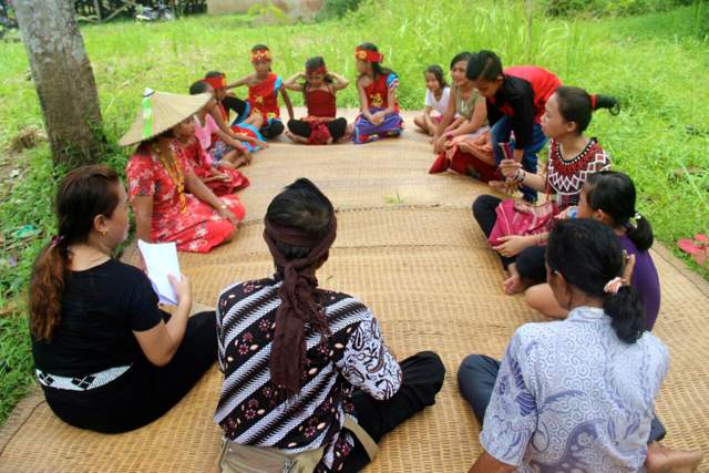 Waktu belajar juga menyesuaikan peserta didik, memanfaatkan jam pulang sekolah, biasa sore hari. Dalam seminggu, belajar tiga kali. “Kami mengajak anak-anak ke ladang, mengamati para orangtua cara menanam padi. Juga belajar sejarah kampung, tarian, cerita, kerajinan, makanan dan permainan tradisional,” katanya.